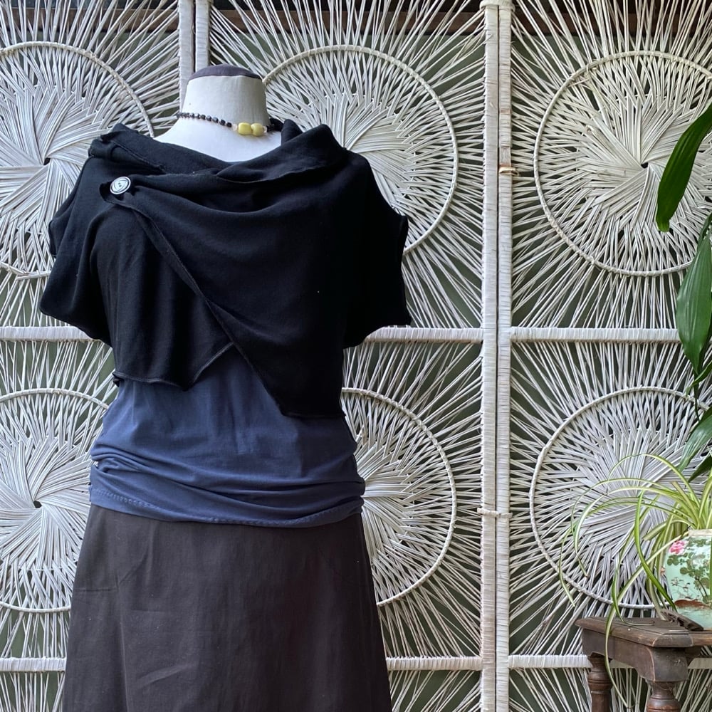 Black wool short sleeve vest M-XL. Can hang open or be secured by a brooch. Can also be worn upside down to create a cowl neck version.