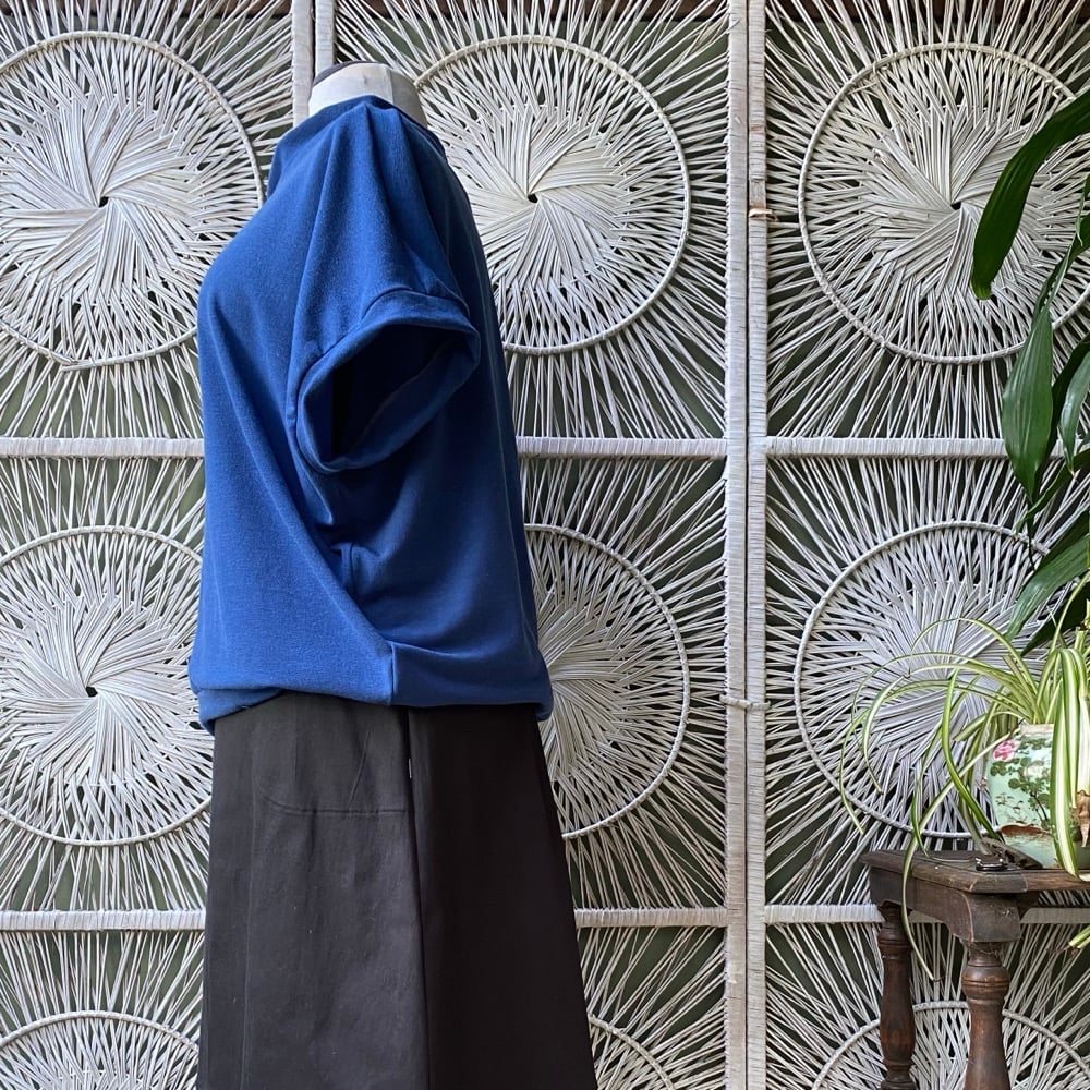Blue knit, loose and drapey layering jumper. Measures… Underarm to underarm 74cm Hip 60cm Length from shoulder front 56cm, back 60cm