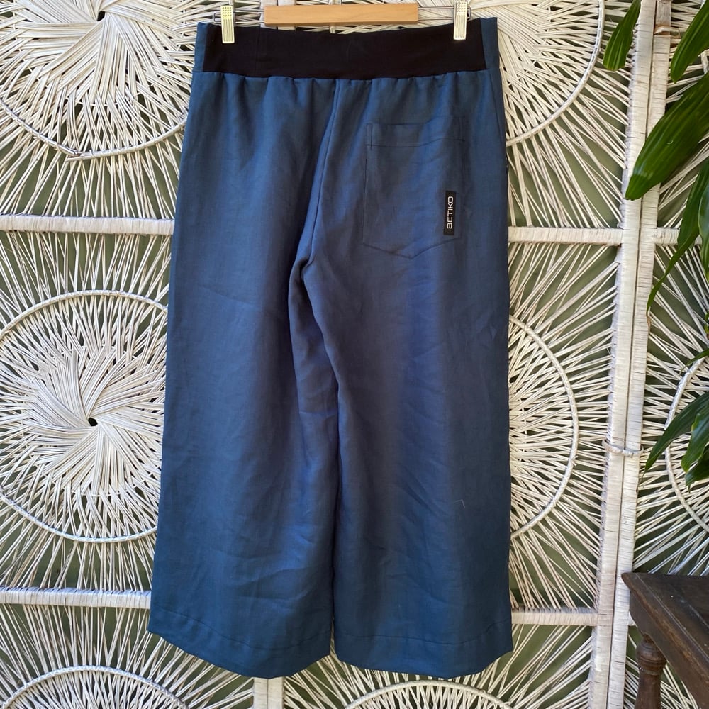 The Louey pants are extremely comfortable and look great, with subtle vertical lines from the two front pleats and a loose wide leg. They have two front pockets, one rear, and an elastic waist. The waistband is fabric at the front and cotton elastane at the back, with an opening to adjust the elastic if needed.