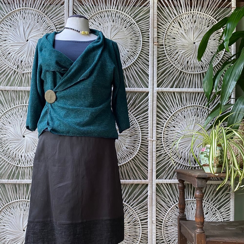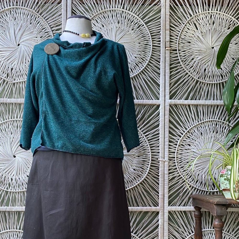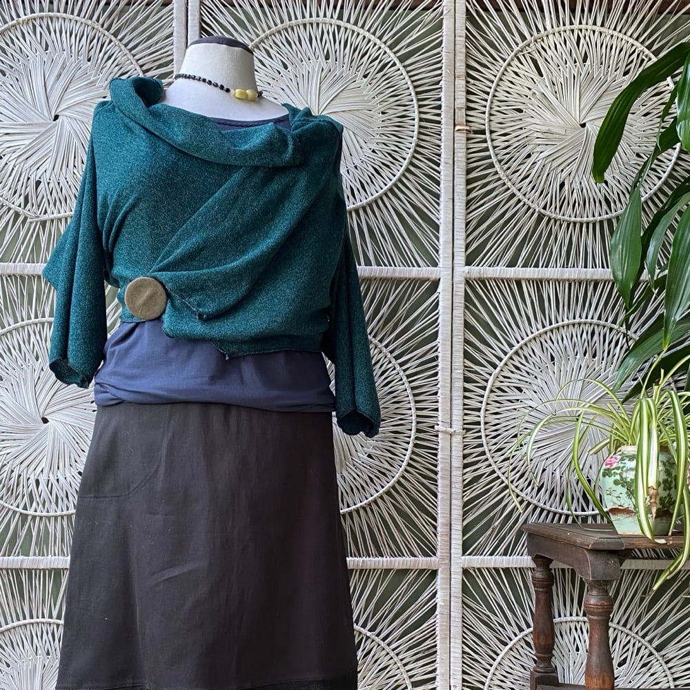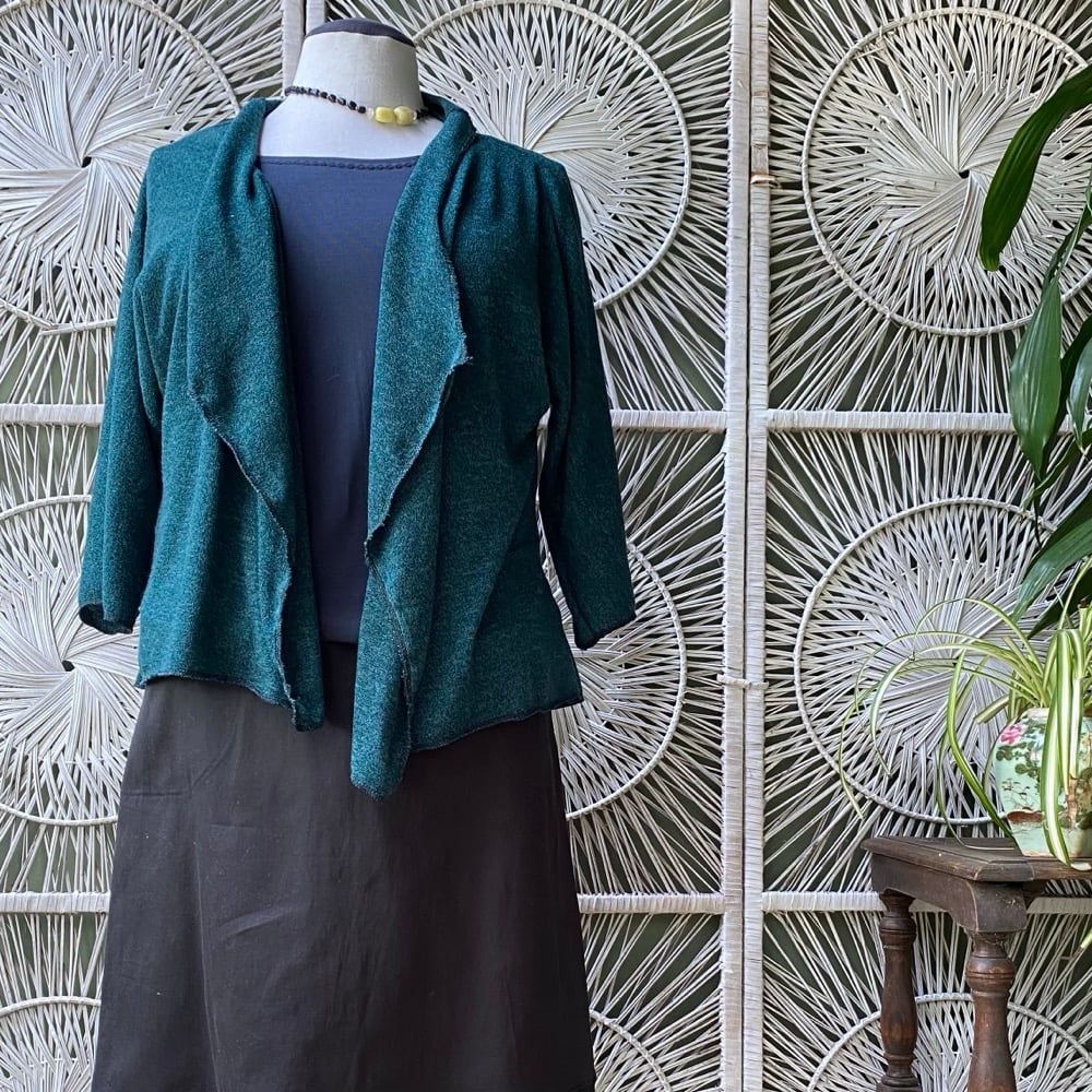 Green mid length sleeve cardi L-XXL. Can hang open or be secured by a brooch. Can also be worn upside down to create a cowl neck version.