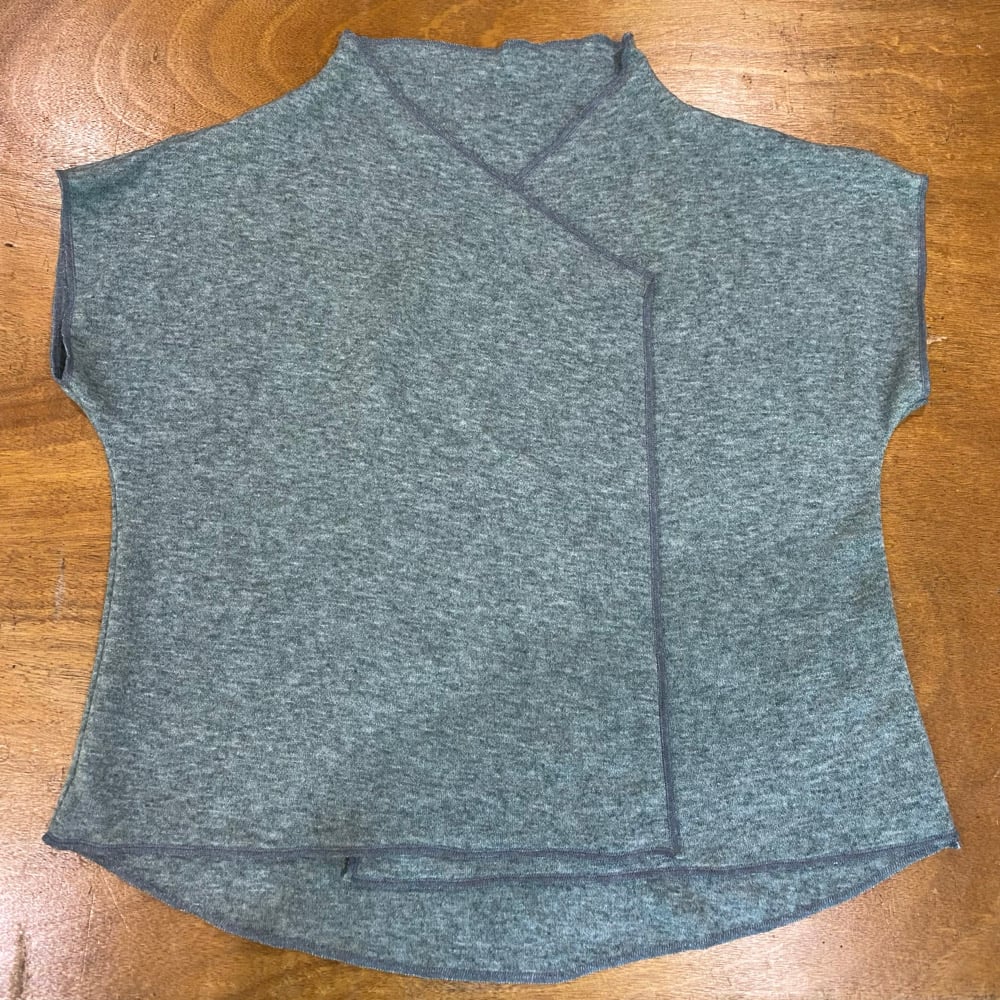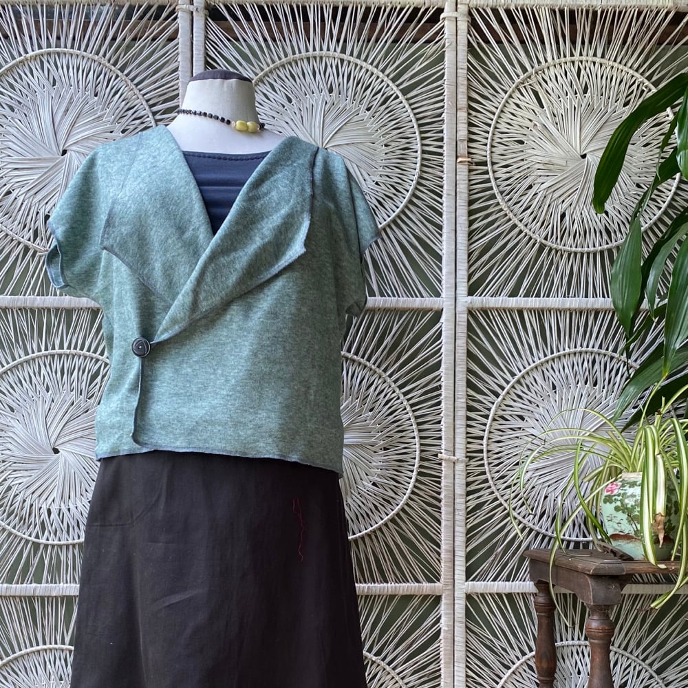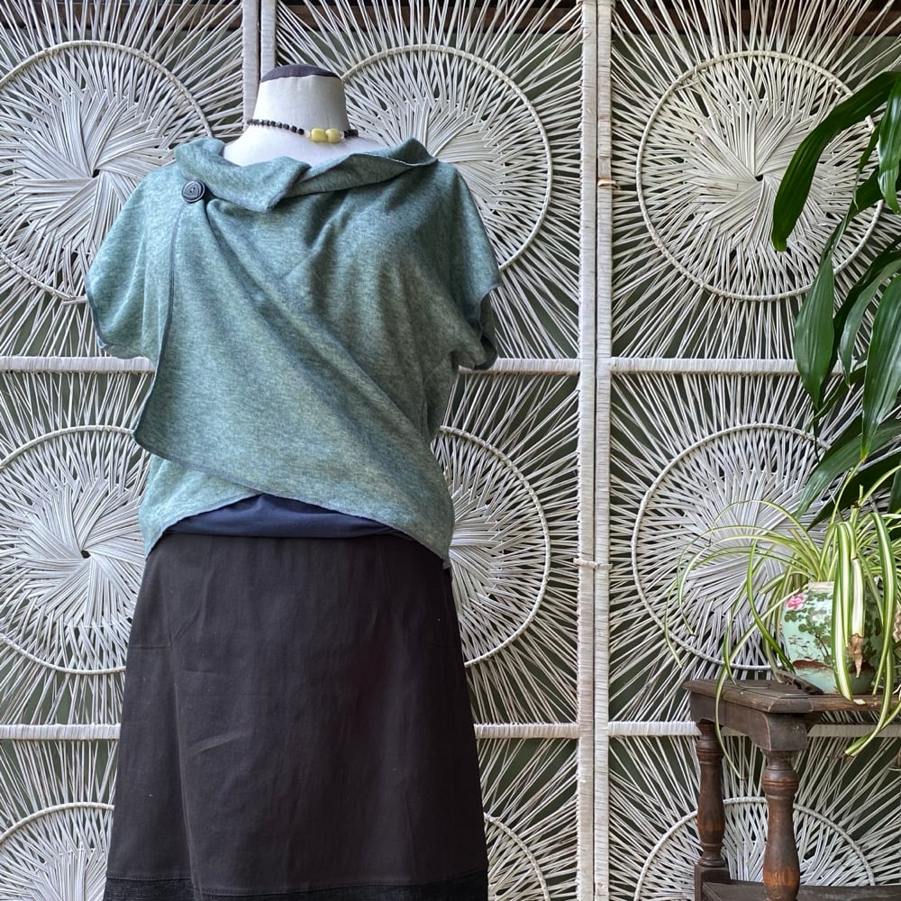 Light green marle short sleeve vest L-XXL. Can hang open or be secured by a brooch. Can also be worn upside down to create a cowl neck version.
